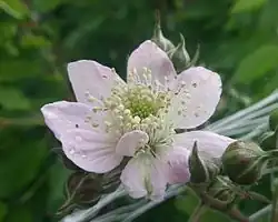 The flowers bloom in late spring and early summer on the tips of branches.[7][8] Each flower is about 2–3 centimetres (341+14 inches) in diameter, with five white-pink petals.[7][8] The fruit only develops around ovules fertilized by the male gamete from a pollen grain. The most likely cause of undeveloped ovules is inadequate pollinator visits.[11] Infection with raspberry bushy dwarf virus sometimes causes no visible symptoms and sometimes causes incomplete drupelet development and crumbly fruit.[12]
