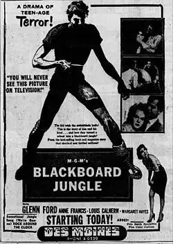 MGM had intended for the film to be promoted as a “portrait of democracy at work”, however advertisements for the film sensationally marketed it as a "Drama of Teen-age Terror," which resulted in large crowds attending screenings due to the controversy.[23] The music led to a large teenage audience for the film, and their exuberant response to it sometimes overflowed into violence and vandalism at screenings.[24] In this sense, the film has been seen as marking the start of a period of visible teenage rebellion in the latter half of the 20th century. The film was banned in Memphis, Tennessee by the Memphis and Shelby County Board of Censors, but was later approved and released for "adults only" showing.[25] The film was also banned in Atlanta, Georgia on March 26, 1955, with the Atlanta Review Board claiming that it was "immoral, obscene, licentious and will adversely affect the peace, health, morals and good order of the city", the ban was later lifted and the film released in July 1955[26][27] The film was blamed for inspiring a gang of girls, aged 12 to 14, in Memphis who burnt down a cattle barn, later stating that they "wanted to be tough like those kids in that picture."[28] It was also blamed by authorities for a spree of "juvenile outbreaks" in upstate New York, and for gang fights which broke out in theaters and drive-ins where the movie played.[29][30]