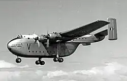 The fuselage directly attached to the tailboom and its large rectangular twin-fin tailplane. The cantilever tail surfaces were all-metal and featured a dihedral to keep them clear of the inboard engine's slipstream.[15] The tailboom permitted access to the rear of the fuselage through removable clamshell doors. A device called an Elephant's Foot could be fitted under the centre of the fuselage just forward of the clamshell doors when loading heavy items to prevent the aircraft from tipping back.[16] The flight deck was positioned relatively high, and was accessed via a ladder in the forward portion of the hold.[15] It accommodated two pilots seated in a side-by-side arrangement, who had favourable downwards visibility due to the shaping of the nose; behind them were the navigator and radio operator, seated back-to-back on bench-style seating. All of the flight controls were hydraulically-augmented to reduce pilot fatigue, although manual reversion was possible.[15]