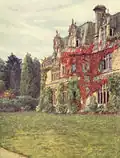Aside from its elevation and beauty, Blackdown is best known as the site of the poet Tennyson's houses, Aldworth and Foxholes. Keen to escape the summer "trippers" who came to his Isle of Wight home, Farringford House, Tennyson purchased Blackdown, and built Aldworth in 1869. The French-style Gothic revival house was designed by Sir James Knowles and built with local sandstone. It stands on a ridge overlooking the Weald, with far-reaching views. Lord Tennyson used it as his summer home, taking long walks over Blackdown. Helen Allingham was a frequent visitor then, and her illustrations to The Homes of Tennyson capture the landscape.[4] Tennyson died in the house on 6 October 1892.