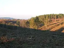 Blackdown is in the far northwest of West Sussex. The hill presents as a dark-sided mass that towers over the western parts of the Low Weald and south-west Surrey. There is no village or hamlet on Blackdown although it lies approximately equidistant from the railway town of Haslemere 2 miles (3.2 km) to the northwest, Fernhurst to the southwest, and Lurgashall to the southeast.[2]