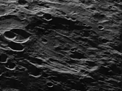 Overall this crater is heavily eroded, with several craters overlaying the southern rim, and smaller formations overlaying the western and northwestern rim. The interior floor has been roughened by ejecta, leaving only parts of the southwest interior in their previous relatively level and featureless condition.