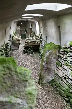 The oblong tomb measures 22.5 m (74 ft) by 8.9 m (29 ft) externally. The cairn encloses a long burial chamber measuring 13.5 m (44 ft) by 2 m (6 ft 7 in), and 2 m (6 ft 7 in) in height.[1] The burial monument was first excavated in 1936. It was determined to have originally been constructed with seven compartments divided by pairs of standing slabs. Four of the original slabs had been removed at the time of excavation. Currently, the tomb is entered through a modern, concrete roof. Skeletal remains of two adult males were uncovered during excavation, along with a pottery bowl, a flint knife, a polished stone axe and animal bones. On the exterior of the tomb, on either side of the entrance, is decorative masonry set in a triangular design, a characteristic trait of Neolithic tombs on the island of Rousay.[2][3]