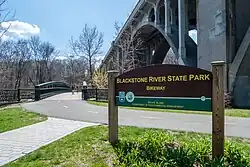 In 2013, five bridges in Blackstone that run concurrently with the Southern New England Trunkline Trail (SNETT) were repaired and repainted. These are the two Factory Pond Bridges, the northern Canal Street Bridge, a Blackstone River Bridge, and the St. Paul Street Bridge. By September 2014, these bridges received new ipe wood decks and safety railings. In 2014, new bridges were also constructed over Kane Court and Main Street, and a tunnel was built under Church Street, all in the town of Blackstone. The entire 3.7-mile path was finally completed in December 2016.[8] Restoration work on the Blackstone Viaduct, located adjacent to the southern terminus of this path, began in 2019.[9] Completed in 2024, the project added approximately 0.5 miles of bike path extending to the Rhode Island border, where it connected with an existing segment of path in Woonsocket.[10][11]