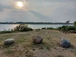 The provincial park and the lake are set in the Blackstrap Coulee,[11] which is a long valley with steep sides. Along the valley, there are several smaller coulees that flow towards the lake as well. In several places along the valley wall and in the smaller coulees, biking and downhill biking,[12] hiking, and cross-country ski trails are set up.[13]