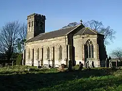 The church, dedicated to the Holy Trinity, was designated a Grade II listed building in 1966 and is now recorded in the National Heritage List for England, maintained by Historic England.[6] The church was constructed in 1841 by John Harper, of ashlar masonry with a west tower, Perpendicular-style windows, and a nave with apse at the east.[7] The stability of a previous Blacktoft church was causing concern in the early 1740s. A contemporary court report noted that the chancel of the church had been re-built to a lower height than one existing earlier, resulting in a gap between the top of the new chancel and nave. This gap was closed by stooths—wooden studs or battens—on the exterior of the nave supporting a beam. The court heard that the earlier higher chancel roof had collapsed in the early 1660s as the congregation were leaving the church—this information was treated with scepticism by a prosecutor, but was supported by local masons and carpenters.[8]