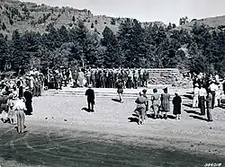 Fire officials believed they needed more manpower, so CCC crews from Bighorn National Forest, 165 mi (266 km) to the east, and other districts of Shoshone National Forest started responding by the morning of August 21.[15][22] By 12:30 pm, more than 200 firefighters were on duty and involved in digging fire line or in support of the firefighting effort.[23] Along one of the small creeks flowing into Blackwater Creek, a small dam was constructed to pocket water supplies for use in backpack water pumps.[24] Due to a long overnight journey, the CCC members from the Tensleep District of Bighorn National Forest did not commence response to the fire until after noon on August 21.[10][25] As they arrived, the Tensleep CCC unit were told to relieve the Wapiti CCC unit that had been fighting the fire since the previous evening.[26] More than 50 firefighters commenced construction of a new fire line along Clayton Creek and Clayton Gulch, a ravine extending east from Blackwater Creek. The construction was led by USFS Rangers Alfred Clayton and Urban Post, and their crews consisted mainly of the Tensleep CCC camp and some from other entities.[6][25]