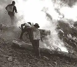 In 1937, firefighters did not have portable radios for rapid on-scene communication or helicopters to bring supplies and provide water drops.[8][9][a] Firefighters had some access to gas-powered portable water pumps (two were set up on the Blackwater Fire), but most used backpack pumps that were manually operated and held limited water.[10][b] Firelines were dug by handcrews using shovels, axes and pulaskis (a tool that could be used as either an axe or a hoe).[12][13] Most firefighters wore cotton and wool clothing, which provided poor protection from flames.[12] Additionally, they did not have fire shelters, which first became available in the 1960s but were not mandatory until 1977.[14] Later researchers believe the use of shelters might have saved lives depending on where the firefighters were when the firestorm occurred.[12][15]