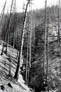 Blackwater Creek originates on the north slope of Sheep Mesa at an altitude of 11,400 feet (3,500 m) in Shoshone National Forest and flows north through Blackwater Canyon. The creek is 12 mi (19 km) long and descends a steep gradient before it empties into the North Fork Shoshone River, across from U.S. Routes 14/16/20 immediately west of Mummy Cave and 15 mi (24 km) east of the border of Yellowstone National Park.[2] The firestorm deaths occurred on the west slopes of Clayton Mountain, approximately 5 mi (8.0 km) south by trail into the canyon.[3][4] The canyon consists of numerous ravines and small ridges, which form a washboard landscape shaped by extensive erosion of the volcanic igneous rock that constitutes the Absaroka Range.[5] The canyon has moderate to steep slopes with a gradient of 20 to 60 percent.[6] The regional flora is an upper montane mixed-conifer forest dominated by Douglas fir trees.[6][7] When the fire swept through the area the forest was dense and mature with heavy fuel loads from dead trees, which also had dead limbs extending to the ground, providing a fuel ladder for fire to easily spread into the tree tops.[6]