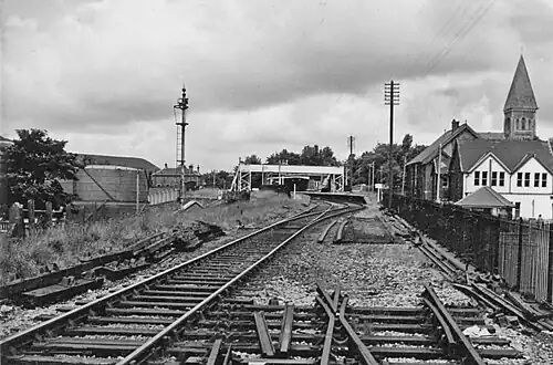 Blaina station opened with the first timetabled service on 23 December 1850.[8][9] It was situated opposite St Peter's Church and to the north of Blaina Reading Institute.[10] To the north lay a network of sidings branching off to serve the Tinplate Works and Lower Deep Pit, while to the south were the Gasworks served by a private siding between 1911 and 1937.[11] The Brynmawr and Blaina Gas Company received around 4000 tons of coal yearly during this period, after which coke oven gas was sourced from Blaenavon.[12] The station had two platforms linked by a covered footbridge which subsequently lost its roof.[13] A pagoda shelter stood on the Down platform, whilst the solidly-built stone station building was on the Up platform with a 42-lever signal box which was in service until 11 October 1964.[14][5] Around 15 staff were employed at Blaina station in the 1930s.[15]