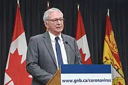 Higgs led the provincial government response to the COVID-19 pandemic in New Brunswick. On March 19, 2020, the government declared a state of emergency.[43] Higgs tested positive for COVID-19 on December 31, 2021.[44]