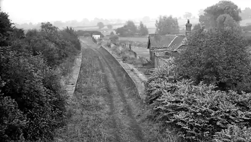 A line from Greens Norton junction near Towcester to Stratford-upon-Avon and the junction with the Great Western Railway's Honeybourne branch line was first authorised in June 1864, but due to a lack of funds it took a further nine years for the line, built by the East and West Junction Railway, to be fully open to traffic.[3] A station was opened at Blakesley, a Northamptonshire village 8+1⁄2 miles (13.7 km) from Blisworth, with two platforms enclosing the running line as well as a loop line which also served as a goods siding. A signal box was located between the east end of the down platform and the loading dock, and to the west a road overbridge carried Blakesley High Street over the line. The station buildings, a one-storey brick building, were demolished by 1952 leaving the station as little more than a halt.[4] Passenger services were withdrawn later that year, with goods continuing for a further ten years.