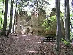 At the top of Great Blaník stands a 30 m tall wooden watchtower from 1941 in the shape of a Hussite tower. On the top of Small Blaník are the ruins of the pilgrimage Chapel of St. Mary Magdalene. Its construction was completed in 1753 but it was abolished in 1783 by a decree of the Emperor Joseph II. The ground plan of the chapel is formed by an octagon composed into an ellipse, under which there used to be a hermit cave. In the middle of the ruins grows a 160-year-old spruce called "Big Monk."