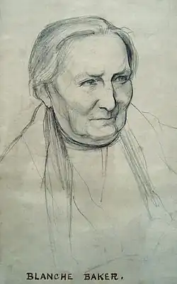 The 1901 census provides a snapshot of life in the Baker sisters’ new home.[49] Blanche's sister Mabel, 39, was the ‘head of the household’. She was an ‘examiner of domestic economy’ in a school. Blanche, 56, was described as ‘an artist (painter) and Teacher of Drawing. School’. They lived with their sister Rosa, 60, and their brother William, 41, who was a clerk at the Stock Exchange. They were supported by one domestic servant living in.