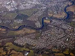 At the western end of the main thoroughfare, Glasgow Road (A724) which runs east–west, is the Priory Bridge neighbourhood (named after the original bridge over the Calder towards Cambuslang,[14] which itself was named after the now-ruined Blantyre Priory to the north of the town which was home to monks from around 1235). It borders the older and larger Coatshill housing estate which has its own schools and community facilities.[15] On the other side of the main road from Coatshill is the similar neighbourhood of Wheatlands (parts of which were built by the Scottish Special Housing Association),[16] while further east is the modern centre of the town, built up from the 19th-century mining communities at Stonefield[17] and Low Blantyre[18] featuring the local secondary school Calderside Academy, Stonefield public park, Blantyre Leisure Centre, several churches and the Clydeview Shopping Centre (which has featured a large Asda supermarket since its opening in 1980).[19][20] Glasgow Road continues south-east via the A725 elevated bypass, the Springwells neighbourhood[21] and the town boundary, leading on to Burnbank (specifically the area once known as Greenfield).[22]