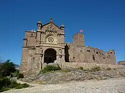 Following practice in stonemasonry Morte developed his own workshop and delivered minor stone cutting works. His status changed in 1883 as he became “contratista de obras”,[24] a building contractor responsible for construction projects. Morte's first major contract was the portico of Iglesia de San Nicolás in Pamplona, designed in eclectic style by the local architect Angel Goicoechea; it was located at the corner of San Miguel and Plazuela streets.[25] In 1884, he was agreed by the Tudela ayuntamiento to build a municipal water reservoir, but the project ended in a lawsuit; the construction proved faulty, Morte blamed the architect and the council blamed him. The case lasted 3 years before he eventually emerged victorious.[26] In 1888, Morte was contracted by the Tudela Jesuits to build a San Francisco Javier college in Tudela; the work was completed in 1891.[27] In the early 1890s he was among builders hired to erect the building of Audiencia de Pamplona, today Parlamento de Navarra.[28] In 1896, Morte started his most ambitious and prestigious contract; the Jesuits who thanks to the donation of duquesa de Villahermosa became owners of the Javier castle decided to turn it into a missionary centre. Apart from other works, Morte was contracted to build a basilica adjacent to the compound. Completion of the shrine, again designed by Goicoechea, took 5 years and the entire Morte family lived on the premises throughout the construction process.[29]