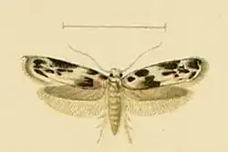 The length of the forewings is about 6 mm. The forewings are white, with blackish-brown markings. The hindwings are shining grey.[2]