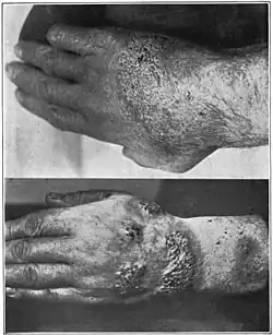 Blastomycosis was first described by Thomas Caspar Gilchrist in 1894, as a skin disease. Because of this, blastomycosis is sometimes called "Gilchrist's disease".[17] Gilchrist initially identified the cause of the disease as a protozoan, but later correctly identified it as a fungus.[73] In 1898, he and William Royal Stokes published the first description of Blastomyces dermatitidis.[73] Gilchrist referred to the disease as "blastomycetic dermatitis".