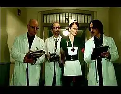 Directed by Sophie Muller from a concept developed in collaboration with Manson, the music video for "Bleed Like Me" was filmed on April 11 at the disused Linda Vista Hospital in Boyle Heights, Los Angeles. During the filming, CNN interviewed the band and broadcast behind-the-scenes footage of the video.[20] Muller wanted the video "to have a Hitchcockian feel," referencing his works Marnie, The Birds, and Psycho. "Shirley sees the video being about love and the nurse as a caring specialist," Muller explained, "I thought it was a brilliant concept but what I didn't want was a sexy nurse wearing pink like a 50 Cent video." Manson chose graphic colours to make the visual image as powerful as the song's subject matter, being particularly delighted with the green tiled walls adorned with red crosses within the location.[21]