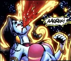 After Krona's body disappears from Ysmault, Atrocitus attacks Bleez, believing her to be responsible. She holds her own against him, causing the other Red Lanterns to realize that Atrocitus is losing his rage and focus.[7] Bleez seizes control of the Corps and leads them in tracking down Sinestro.[8]