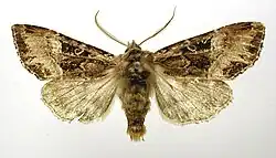 Blepharita amica is a moth of the family Noctuidae. It is found from northern Europe to the Russian plain, the Ural, Siberia (West Siberian Lowland and South Siberian Mountains), the Amur Oblast, Primorye Region and Kazakhstan. It has also been recorded from the Korean Peninsula, Japan (Hokkaido and Honshu) and north-eastern China.