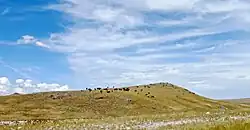 The Bleu Horses is a set of 39 horse sculptures made primarily of steel and permanently installed on a hillside off Highway 287 just north of Three Forks, Montana.[1] The name of the installation is taken from a color of horse known as a blue roan, though the live animal color is closer to gray.[2] The horse sculptures were created and set up by artist Jim Dolan of Belgrade, Montana, who previously had created other complex outdoor sculptures over the previous 30 years, including a herd of elk placed upon the lawn of a bank in Bozeman, and a fly fisherman sculpture in Ennis.[3] He also donated four of his sculptures at Montana State University (MSU), and installed a flock of geese in the terminal of Bozeman Yellowstone International Airport.[4]