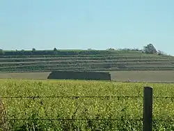 The rampart was built a considerable time later than the original timber palisade that defended the early settlement.[8] The rampart was originally 6.4 metres (21 ft) wide, with a 4 metres (13 ft) gap between the inner and outer retaining timber supports.[9] The rampart was built from chalk packed firmly between the timber retainers.[10] The second phase of the rampart was of the "Low Dump" type, with an asymmetrical cross-section and a shallow incline towards the rear, with a much steeper front dropping directly into the ditch.[11] This replaced the earlier filled-timber wall-and-fill style of rampart.[12] In the eastern part of the hillfort, the rampart has been badly damaged by ploughing, and in places destroyed. In the western portion, part of the rampart survives as a sunken lynchet, and the ditch there survives as a flat terrace.[2] In the first phase of the rampart, the ditch was approximately 1.5 metres (5 ft), but when it was recut for the second phase it was deepened to 4.6 metres (15 ft).[2] The hill features a number of unusual terraces or lynchets, the age and function of which is unknown, although they are believed to post-date the Iron Age.[2]