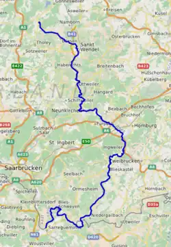 The Blies (French pronunciation: [bliz]; German pronunciation: [bliːs] ⓘ) is a right tributary of the Saar in southwestern Germany (Saarland) and northeastern France (Moselle). The Blies flows from three springs in the Hunsrück near Selbach, Germany. It is roughly 100 km long, ending in the French city of Sarreguemines. It flows through Sankt Wendel, Ottweiler, Neunkirchen, Bexbach, Homburg and Blieskastel (Blieskastel being named after the river). Its lower extent demarcates part of the Franco–German border. The section within France and on the French-German border is 19.7 km (12.2 mi) long.[1]