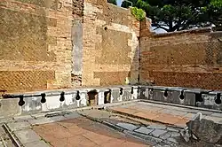 The baths adhere to a specific ritual, "centered on the contrast of heat and cold,"[E 15] reflected in the architectural design.[E 2] The building layout is linear, reminiscent of a style found in Pompeii,[C 7] with the monumental effect enhanced by two wings of shops that provide symmetry.[E 16] However, the classic circuit is disrupted by the arrangement of various spaces due to expansion works.[E 5]