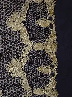Blonde lace is a continuous bobbin lace from France that is made of silk. The term blonde refers to the natural color of the silk thread.[1] Originally this lace was made with the natural-colored silk, and later in black.[2] It was made in the 18th and 19th centuries.[2] The pattern, which is generally of flowers, is made with a soft silk thread, thicker than the thread used for the ground.[1][3] This causes a big contrast between the flowers and the ground.[3] It uses the same stitches as Chantilly lace and Lille lace,[3] and is similarly made in strips 5 in (13 cm) wide and invisibly joined.[1][3]