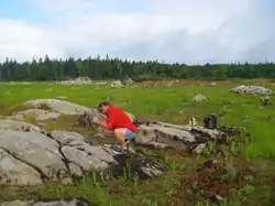 The Bloody Creek structure lies within the Southern Upland of southwestern Nova Scotia. The Southern Upland consists of poorly drained, gently-rolling, hilly topography that is characterized by glacially deranged drainages and extensive lakes and wetlands. A large granite batholith, which has intruded slate and greywacke, underlies the Southern Uplands. Within this region, bedrock is poorly exposed as the result of low relief; a widespread surficial blanket of glacial till; and numerous large depressions filled with either wetland peat or occupied by lakes. The blanket of glacial till is relatively thin, typically less than 5 meters (16 ft) thick, and consists of loose sandy sediment that contains an abundance of locally derived angular cobbles and boulders. The exposed bedrock has been glacially sculpted and polished. At the site of the Bloody Creek structure and elsewhere in the region, roches moutonnées and lee-side plucking features can be seen.[4][5]