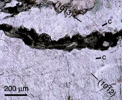 Petrographic analysis using thin sections of samples collected proximal to the geomorphic rim of the Bloody Creek structure provide abundance evidence of shock metamorphism that is indicative of a hypervelocity impact associated with this structure. This evidence includes microbrecciation and cataclasis, kink-banding and rare planar microstructures in feldspar, reduced mineral birefringence, common mosaicism and planar microstructures in quartz, kink-banding in mica, and systematic degradation of biotite to chlorite showing plastic deformation and flow microtextures. The planar microstructures consist of rare planar fractures and possible planar deformation features. Of these features, the planar deformation features, known as shocked quartz, are considered uniquely diagnostic of shock metamorphism that was the result of an extraterrestrial impact.[2][4]