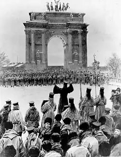 ![]() Crowd of petitioners, led by Father Gapon, near Narva Gate, St. Petersburg | |||