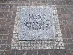 Days after Olkusz was abandoned by the retreating Germans in January 1945, local inhabitants raised a number of crosses and a metal plaque in remembrance of the victims of 1940 events. The street in which Łapiński's villa was located was renamed that year to the "20 Executed" (20 Straconych). Stone plaques in memory of the events of July 16 were dedicated in the town in 1961. In 1982, at the Olkusz Main Square, a new plaque, and a separate obelisk, were unveiled, this time in remembrance of the events of the Bloody Wednesday.[7][15]: 72 Since the war ended, the local administration has been holding remembrance ceremonies each year on July 31.[4]: 16