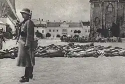 After two weeks of relative quiet, a second German punitive expedition arrived in Olkusz shortly after midnight on July 31. It included Gestapo personnel, as well as members of German gendarmery and police, and possibly – accounts vary – regular Wehrmacht soldiers. From around 2:00 a.m German forces started to gather all the local men at least 15 years old who were either ethnic Poles or Polish Jews.[4]: 19–21 Prisoners were told to lie down flat, face down, on the ground for many hours, until about 3:00 p.m., while the Germans verified their documents, and in the meantime were subject to abuse and beatings. Some victims were ordered to take part in a makeshift parade and bathe in the local muddy river and its banks. Jewish inhabitants were often singled out for extreme abuse, stripped naked, stomped upon, forced to recite Christian prayers, and even to stone one another.[4]: 20–21 [5]: 95 [8]: 176–179 [11] One witness reported an incident in which a German soldier crushed the face of a Jew on whom he stomped. A photograph of Rabbi Moshe Hagerman the Dayan, one of several taken by German soldiers, would become one of the most famous images from that day, and also described as one of the iconic images of the Holocaust in Poland.[10][12]: 37, 40 [13]: 107 Rabbi Hagerman, forced by Germans to pray, for their amusement, and abused on that day, survived until 1942, when he was murdered in Majdanek concentration camp.[10] Rabbi Hagerman's photograph became best known outside Poland, while in Poland the better known picture, described as "known to everyone in Olkusz", shows a lone German sentry guarding a group of prone men lying down in the Olkusz town square.[9]: 212