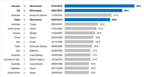 - ^ The blue bars highlight the Federated States of Micronesia national under-23 football team's performance in the 2015 Pacific Games; as of June 2016, the worst performance by any national representative team at an official event.
