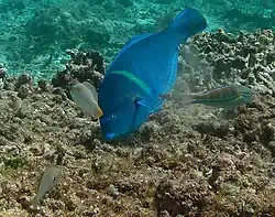 The blue-spotted wrasse (Anampses caeruleopunctatus) is a species of wrasse found from the Atlantic coast of South Africa through the Indian Ocean to Japan and Australia east to Easter Island in the Pacific Ocean (though absent from Hawaii). This species is found at depths from 3 to 30 m (9.8 to 98.4 ft), with the adults preferring the surge zone on coral reefs or along rocky coastlines. Juveniles orient their bodies and move in such a way as to resemble floating leaves. This species can reach a length of 42 cm (17 in). It is of minor importance to local commercial fisheries and can be found in the aquarium trade.[2]
