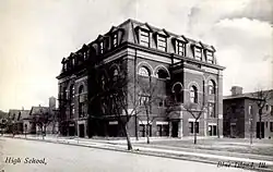 The Blue Island Opera House[17] was built by Blue Island's first mayor John L. Zacharias to replace the Robinson Block, which was destroyed by the Great Blue Island Fire of that year. The opera house was host to vaudeville and repertoire shows until 1913, when it became the Grand Theater and a venue for motion pictures. In later years the building was home to the Blue Island Sun-Standard newspaper and Kline's Department Store. Although the auditorium has been remodeled out of existence, the building, with its award-winning exterior restoration, today provides both commercial and office space to the historic "uptown" district. The building has been designated as a landmark[18] by the Blue Island Historic Preservation Commission[19] It was designed by the American/Canadian architect Hugh Griffith Jones, who also designed Blue Island's first Greenwood School (demolished) and a commercial building with a flat above (c. 1895, extant, also now a city landmark) for Albert and Emma Schmidt at 312 (now 13022) Western Avenue. The architect's drawings for the opera house were used by Jones in the package he prepared to justify his successful application for membership in the Royal Architectural Institute of Canada.[20]
