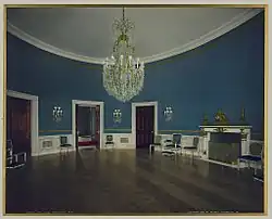 The Blue Room is one of three state parlors on the first floor in the White House, the residence of the president of the United States. It is distinctive for its oval shape. The room is used for receptions and receiving lines and is occasionally set for small dinners. President Grover Cleveland married Frances Folsom in the room on June 2, 1886, the only wedding of a President and First Lady in the White House.[1] The room is traditionally decorated in shades of blue. With the Yellow Oval Room above it and the Diplomatic Reception Room below it, the Blue Room is one of three oval rooms in James Hoban's original design for the White House.