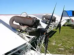 The Twin Engine EZ Flyer can be equipped with a variety of powerplants, all mounted side-by-side in pusher configuration:[4]