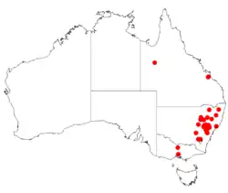 This species of wattle is found in sand over sandstone in forest or open woodland, often in rocky places, mostly on the western slopes of the Great Dividing Range between the Warrumbungle Range, Baradine, Lithgow and near Burrinjuck in New South Wales.[2][3]