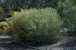 Acacia caesiella, commonly known as tableland wattle, bluebush wattle or blue bush,[2] is a species of flowering plant in the family Fabaceae and is endemic to New South Wales, Australia. It is an erect or spreading shrub, sometimes a small tree with smooth bark, narrowly elliptic to linear phyllodes, spherical heads of yellow, bright yellow or deep yellow flowers, and straight to slightly curved, firmly papery to thinly leathery, glabrous pods.