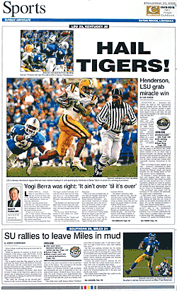 |  The sports page of the Baton Rouge Advocate on November 10, 2002, the day after the "Bluegrass Miracle." The top photo shows Kentucky defenders deflecting the pass, and the large center photo shows LSU wide receiver Devery Henderson right after catching the pass for the walk-off touchdown. | |||||||||||||||||||