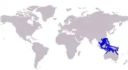 The bluespotted trevally inhabits the tropical waters of the East Indian-West Pacific Ocean, and is restricted to a smaller range than most of its relatives. The species range extends from the waters of the South China Sea around Taiwan and Borneo south through eastern Indonesia and the Arafura Sea around Papua New Guinea.[6] The species is commonly found off northern Australia, especially the Gulf of Carpentaria, but is occasionally seen as far south as Gladstone, Queensland.[8]