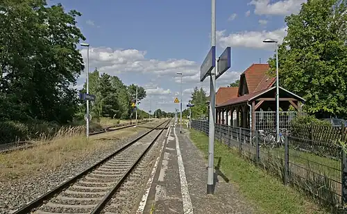 Blumberg (bei Berlin) station is a railway station in the Blumberg district of the municipality of Ahrensfelde, located in the Barnim district in Brandenburg, Germany. It is served by the Regionalbahn service RB 25 of the Niederbarnimer Eisenbahn.