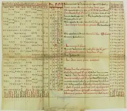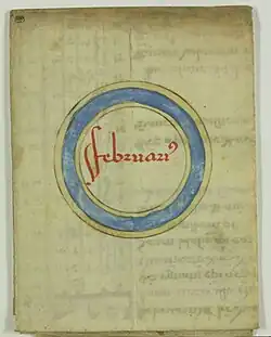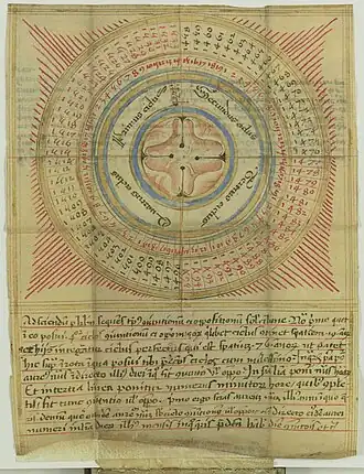 Latin 7478 consists of 17 folded leaves, perhaps previously attached to the tabs, but throughout the manuscript conservation it has obtained a new binding more like a traditional codex. It follows the pattern similar to what Johan Peter Gumbert calls H6r pattern: with the leaves opening on the top as well, then the first compartment unfolding the right, and only the last one on the left.[5][6] Latin 7478 has been copied by Paul of Kignin (could be also read as Szignin), whose autograph is found on folio 15, along with the supposed date of the manuscript production: 1456. The identity of the scribe remains to be investigated. However, some of the scholars presume that at least two people have been involved in the production of Latin 7478: a rather skilled almanac-maker, able to abbreviate diagrams and tables with a minimal loss of information, and a less experienced scribe, able to adapt 19-years cycles to a required date, lacking the knowledge to perform this procedure without distorting the time of syzygies.[7]