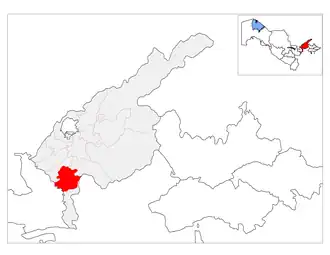 Boʻka District is a district of Tashkent Region in Uzbekistan. The capital lies at the city Boʻka.[1] It has an area of 590 km2 (230 sq mi)[2] and it had 127,500 inhabitants in 2021.[3] The district consists of one city (Boʻka) and 8 rural communities (Iftixor, Qoraqoʻyli, Turon, Koʻkorol, Qoʻshtepa, Namuna, Rovot, Chigʻatoy).[1]