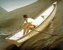 Lifeboat, 80 x 100 inches, oil on linen, 1998, private collection, previously on loan to the Bo Bartlett Center, Columbus State University, Columbus, GA. Lifeboat is inspired by Winslow Homer’s The Fog Warning. The man in the rowboat is dressed casually and the day is bright, yet he is surrounded by threats including a shark in the water and a large crashing wave.[10]