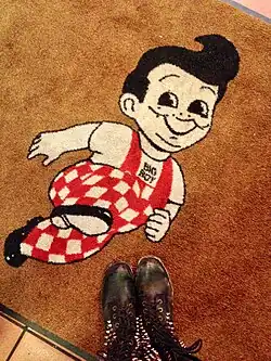 The Rite Spot also offered curb service, as Bob's Big Boy would several years later.[9] (His sister Dottie was a carhop at the Rite Spot before moving to Bob's Big Boy.[9]) However, Wian's first drive-in work was at a Pig Stand.[8] The restaurants used pig-shaped die-cut menus and some had a big pig in front; similarly, Bob's would use Big Boy shaped die-cut menus and later display large Big Boy statues out in front.