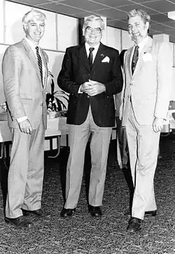 Katter was a strong supporter of Queensland premier Joh Bjelke-Petersen. In August 1989 he abruptly resigned from the cabinet of Bjelke-Petersen's successor Mike Ahern, along with fellow cabinet ministers Russell Cooper and Paul Clauson. Their resignation was reportedly an attempt to force Ahern's removal as party leader.[13] Bjelke-Petersen subsequently endorsed Katter to succeed Ahern as leader and premier.[14]